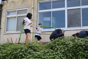2,3年生で、除雪作業でゆがまないように駐車場棟の柵を外したり、積雪で窓ガラスが割れないよう囲いをつけたり、その他、チューリップの球根を植える作業を手分けして行いました。