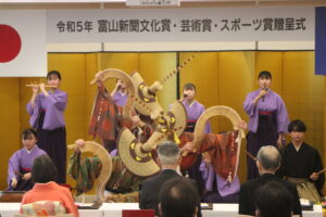 富山新聞社の第53回芸術賞の受賞式が、3月11日、高岡市の富山新聞高岡会館で行われ、本校郷土芸能部が受賞しました。