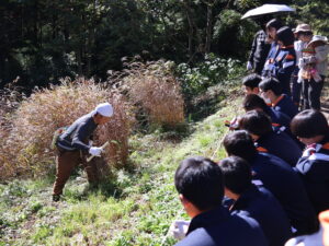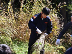 最初は鎌や熊手を扱うことに苦戦していた生徒たちでしたが、相倉合掌造り集落保存財団の中島さんに指導していただき、徐々に要領をつかみ、手際よく、茅を収穫することができました。
