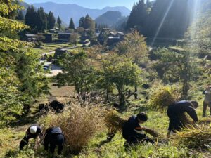 合掌造りの屋根の素材である茅を鎌で刈り取り、熊手で雑草などをかき出す作業を行いました。