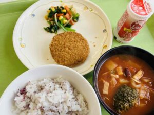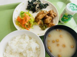 ごはん 鶏肉のから揚げ きんぴら風煮 おひたし なめこのみそ汁 ジョア