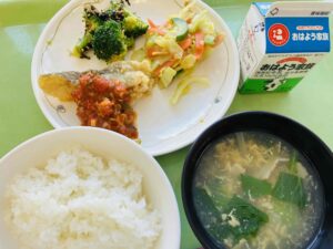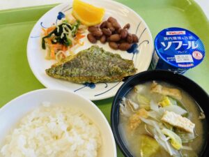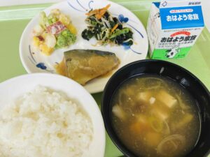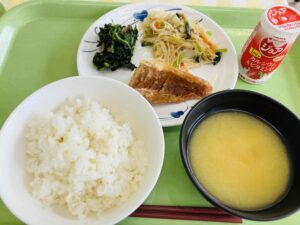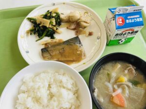 ごはん 魚の照り焼き 小松菜のおひたし おからの炒り煮 白菜のみそ汁 果物 牛乳
