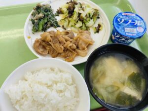 ごはん 豚肉の生姜焼き ほうれん草とれんこんのごま和えチーズサラダ