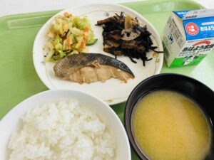 ごはん 鮭のみそチーズ焼き ひじきの炒り煮 小松菜の柚子和え けんちん汁 牛乳