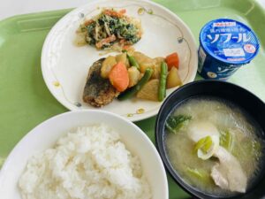 ごはん 鯖のカレー焼き 春雨の梅肉和え 小松菜の煮浸し かぼちゃのそぼろ汁 ジョア