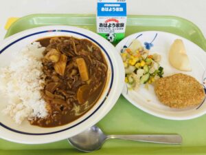 ハヤシライス コロッケ サイコロサラダ 果物(梨) 牛乳