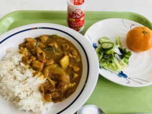 みんな大好きカレーライスは、噛み応えUP、食物繊維が豊富な押し麦をまぜて、麦ごはんにしています。