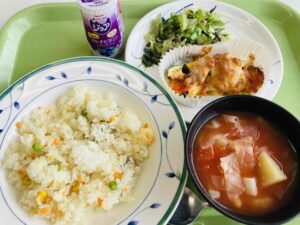たんぱく質:38.5g ☆インターハイ補助のため、1学年のみの給食でした。少人数のため、新メニュー、オムライス。卵は一枚一枚手焼きです。クリームシチューの鮭は一度焼いたものを仕上げに入れているので、臭みもなく、おいしく食べられます。