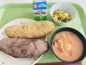 たんぱく質:37.3g ☆インターハイ補助のため、1学年のみの給食でした。少人数だったので、新メニュー、ピザトーストです。ソースも手作りで具だくさんのトーストは食べ応えがあります。