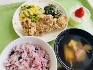 くれないごはん 鶏肉のから揚げ ほうれん草の磯和え 春雨の酢の物 すまし汁 プリン